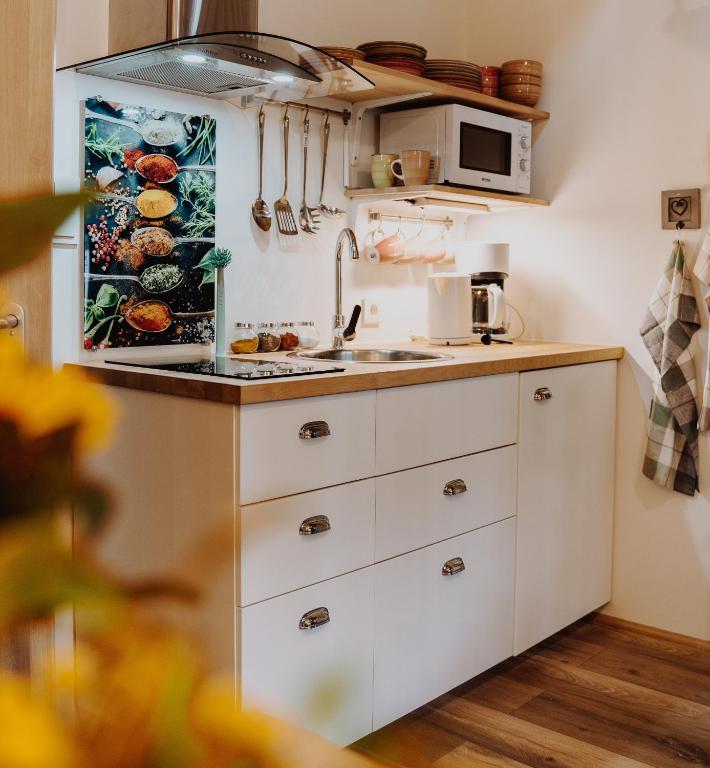 Equipped with a modern kitchenette featuring a dishwasher and coffee machine, the apartment comfortably accommodates up to two people. The well-appointed bathroom includes a shower and a hairdryer, ensuring a refreshing experience after each day's adventures.