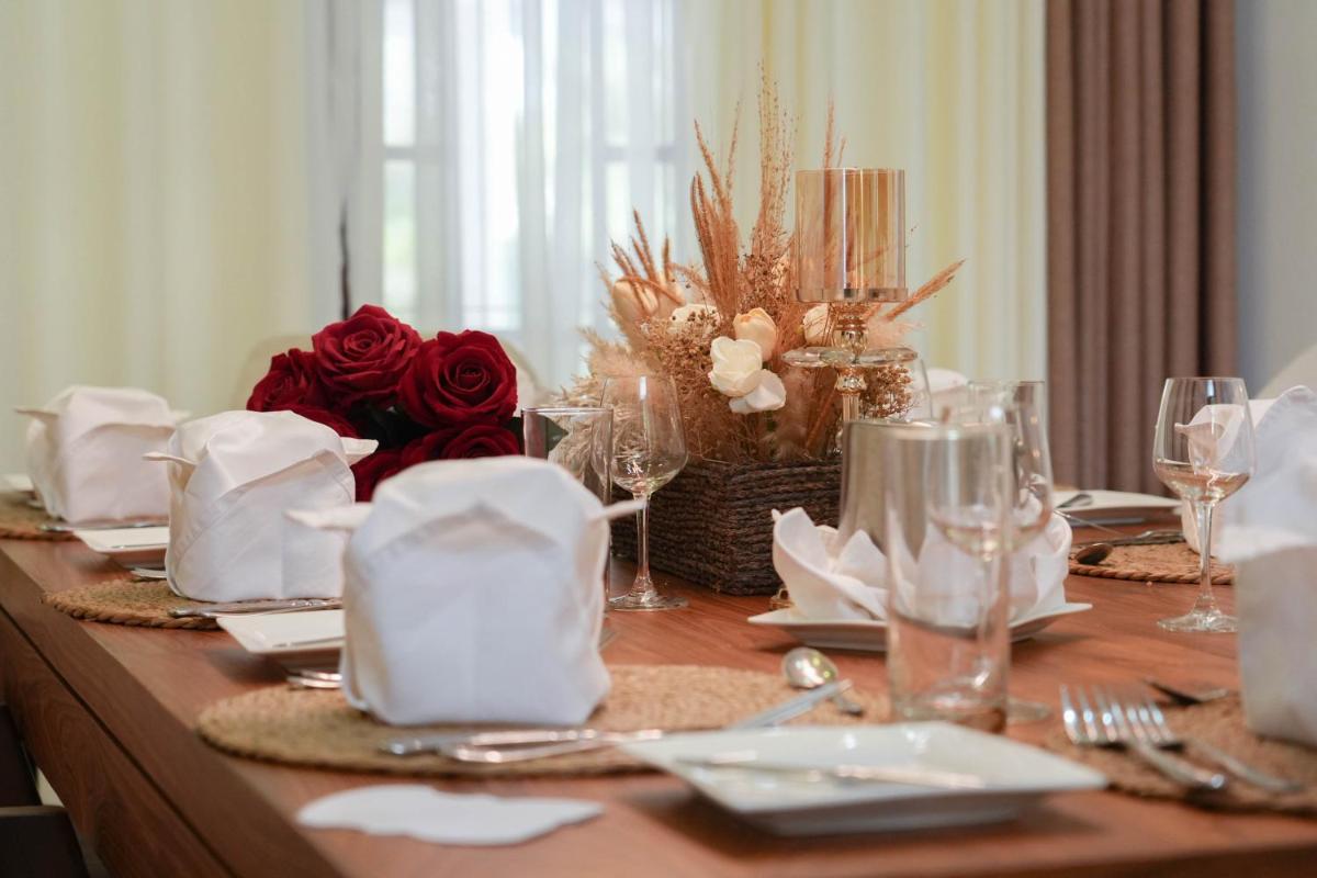 The villa comprises five spacious bedrooms, each offering ample space and comfortable bedding. A private balcony provides stunning views of the garden, while the villa's satellite flat-screen TV keeps guests entertained throughout their stay. To enhance their experience, guests have the option to dine at the on-site family-friendly restaurant, where they can enjoy meals at various times during the day.