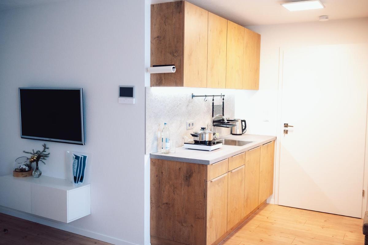Elevated above the bustling cityscape, Suite 13 Apartment mit Netflix welcomes visitors with ease, offering a blend of modern amenities and thoughtful details designed to enhance their stay. Featuring one spacious bedroom, a fully equipped kitchenette equipped with essential appliances such as a microwave and a washing machine, this space caters to culinary adventures and daily chores alike.