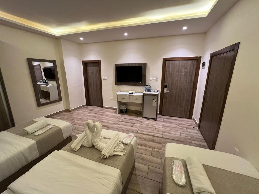 Sky Hotel, situated in Aqaba, is an inviting accommodation offering a perfect blend of comfort and convenience. Located just 12 minutes' walk from Al-Ghandour Beach and conveniently close to the Royal Yacht Club, this 4-star establishment boasts a welcoming atmosphere and numerous amenities designed to enhance your stay. Free Wi-Fi is available throughout the property, ensuring smooth internet connectivity wherever you choose to rest. Guests can relax in their spacious rooms equipped with essential features such as air conditioning, a flat-screen television with satellite channels, a mini-fridge, an electric teapot, and a bidet. Each room comes with a safety deposit box, providing an added level of security, while some offer terraces for a serene retreat, while others enjoy panoramic mountain views.