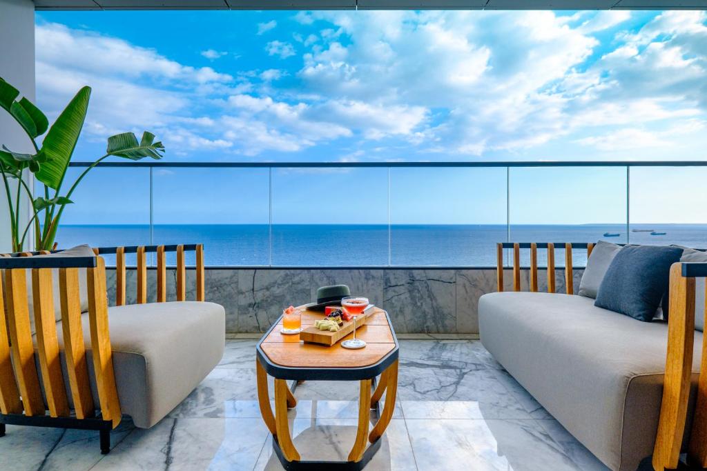 The Icon Limassol in Limassol boasts a stunning location overlooking the picturesque sea, offering guests breathtaking views from every angle. Nestled along Dasoudi Beach, just steps away from the crystal-clear waters, this luxurious resort combines modern amenities with serene surroundings.