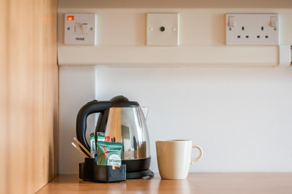 Each guestroom at Holland Hall features an en-suite study bedroom equipped with tea and coffee-making facilities, a mini-fridge, and complimentary WiFi. The bathrooms offer wet-room design with showers. Guests have the option to request additional toiletries upon check-in. No TVs are installed in the rooms; however, the common area boasts a television for entertainment purposes.