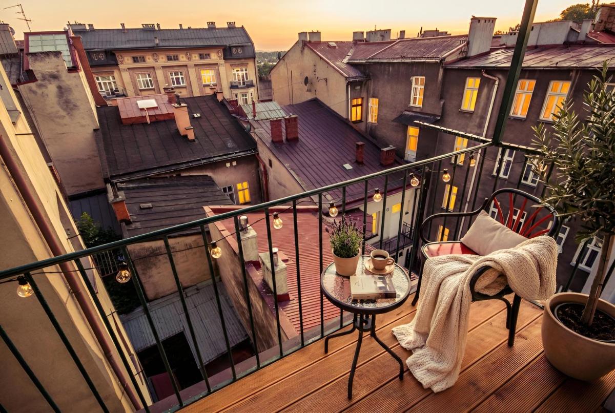 The place has a balcony overlooking the preserved old-town.