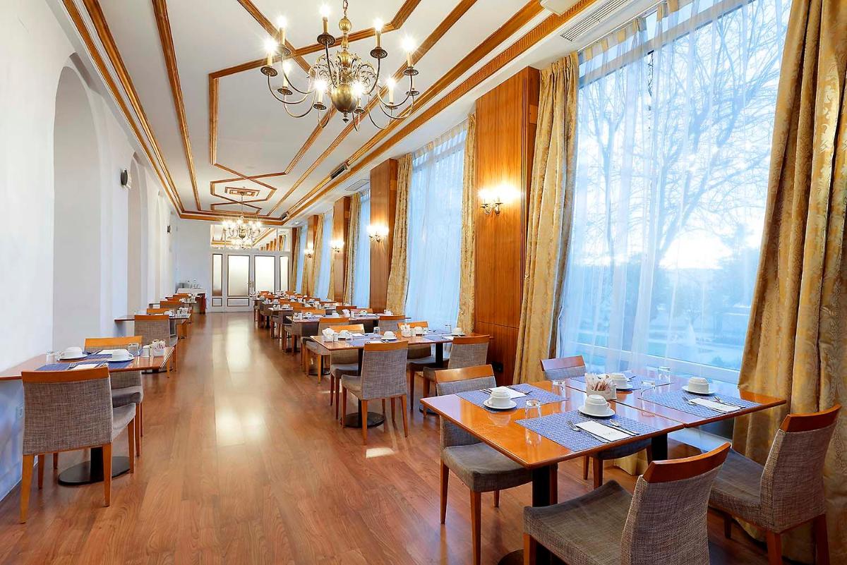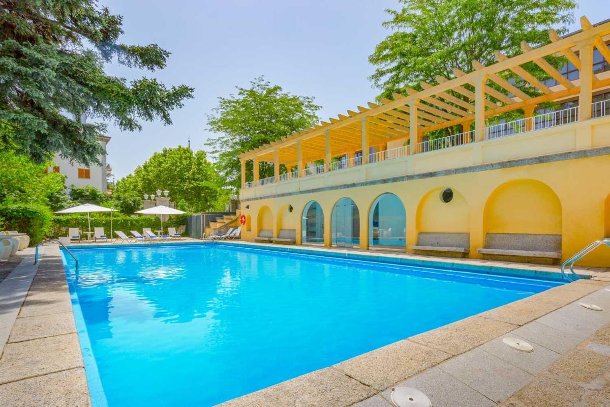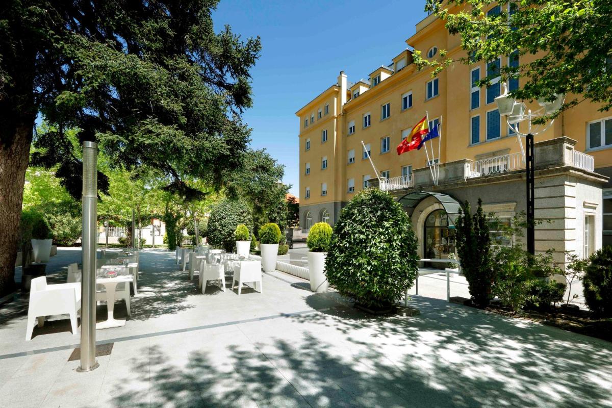 The 4-star Exe Victoria Palace, dating back to the 18th century, stands just 656 feet away from the Escorial Monastery. This elegant royal palace boasts free Wi-Fi, a sauna, stunning views, and a charming terrace overlooking its own facade. Nestled in the picturesque surroundings, this historic gem is conveniently placed near the Auditorium, offering easy access to various attractions such as the Valle de los Caídos and Madrid's urban centers. With its blend of traditional architecture and contemporary design, coupled with exceptional dining options and excellent accommodation facilities, the Exe Victoria Palace is an ideal choice for both couples seeking a romantic getaway and those looking for a memorable stay in the heart of Spain.