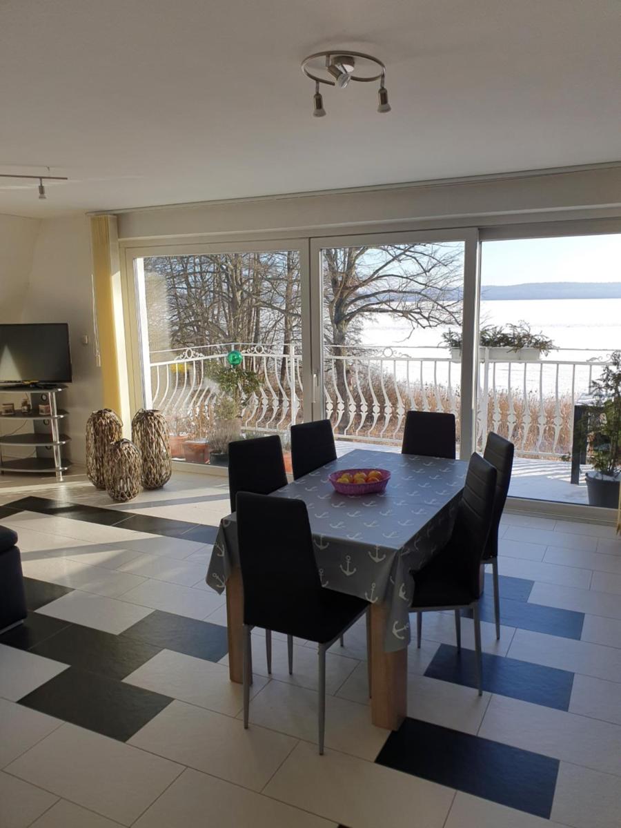 The apartment is described as spacious, tastefully furnished, and well-equipped with a balcony for viewing the lake.