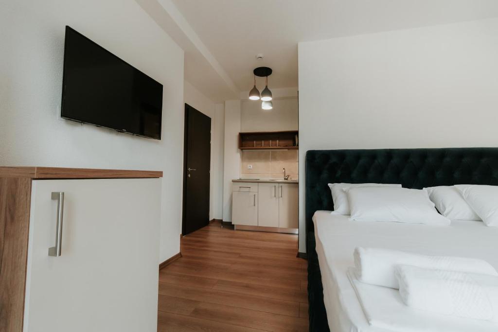 Villa TEMA in Ohrid offers accommodation featuring quiet street views, a shared lounge, and various amenities such as a family-friendly restaurant, garden, and barbecue facilities. Each unit includes a fully equipped kitchenette, flat-screen TV, and private bathroom with complimentary toiletries. Guests enjoy buffet breakfast with local specialties and access to a bike rental service. Located near historical landmarks and Ohrid Airport, Villa TEMA provides a comfortable stay in Ohrid's vibrant atmosphere.