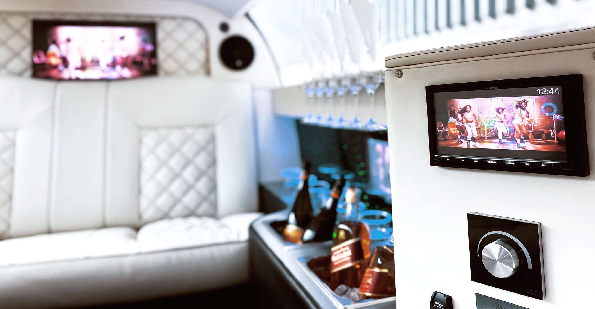 Complimentary champagne service is included along with other amenities such as state-of-the-art audio equipment, high-definition televisions, refrigerators, and dazzling lighting.